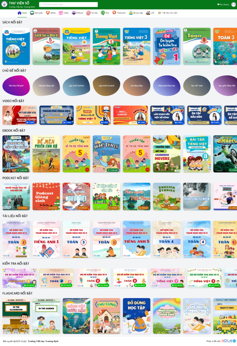 •  Sách giấy: Thư viện số Dlib K12 quản lý và số hoá sách thư viện theo chuẩn Dublin Core, giúp tìm kiếm và truy xuất thông tin dễ dàng. Môi trường số tiện lợi cho quản lý tài nguyên và mượn trả. Phụ huynh và học sinh dễ dàng tiếp cận nguồn tài nguyên, khuyến khích đọc sách tại thư viện hoặc mượn về nhà.